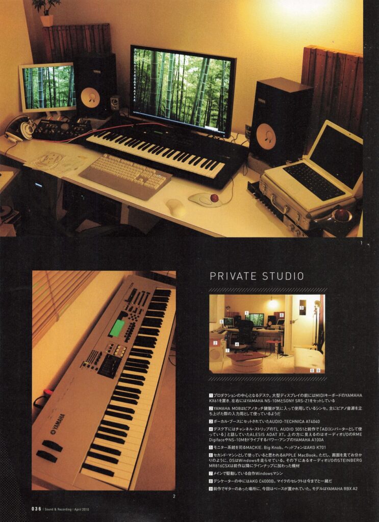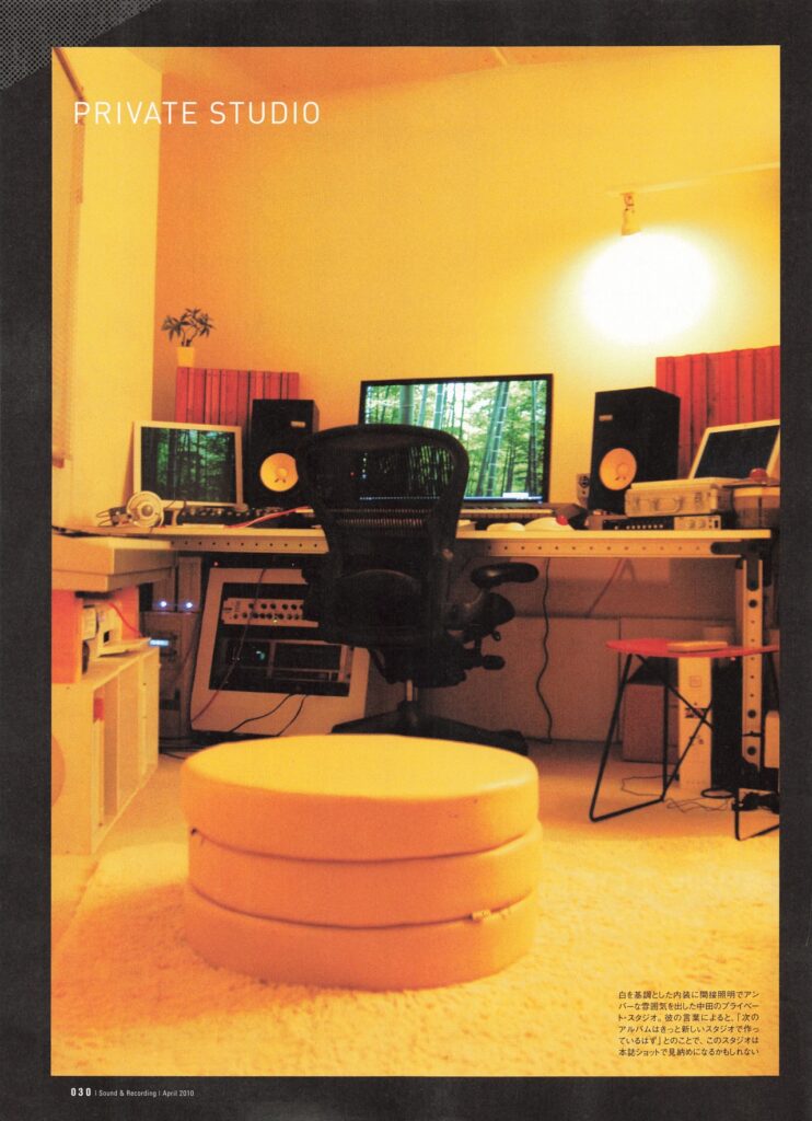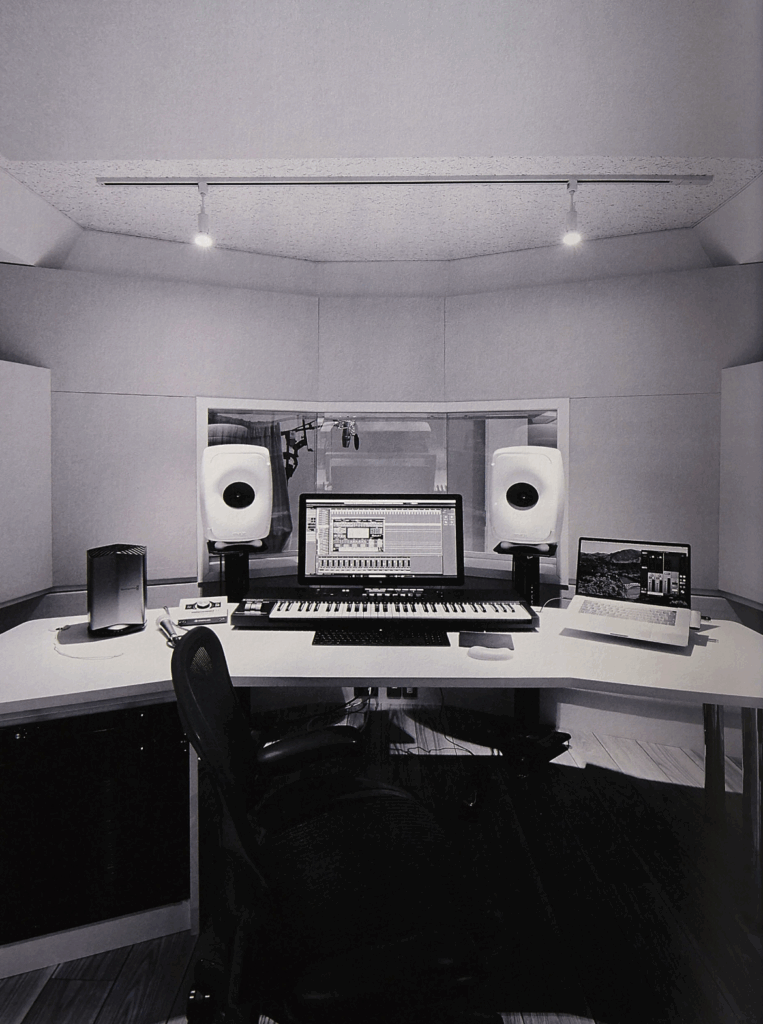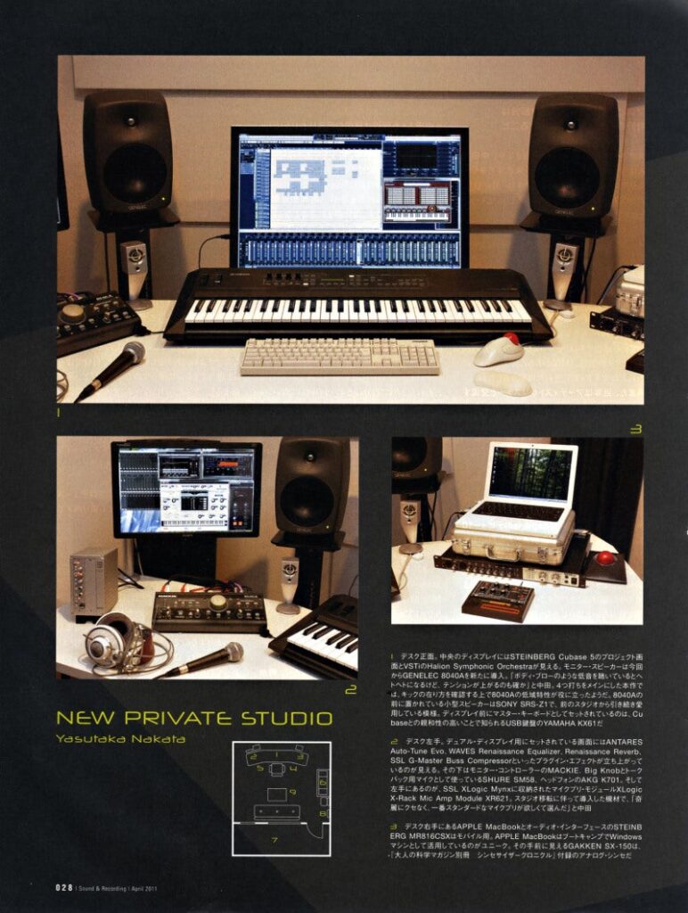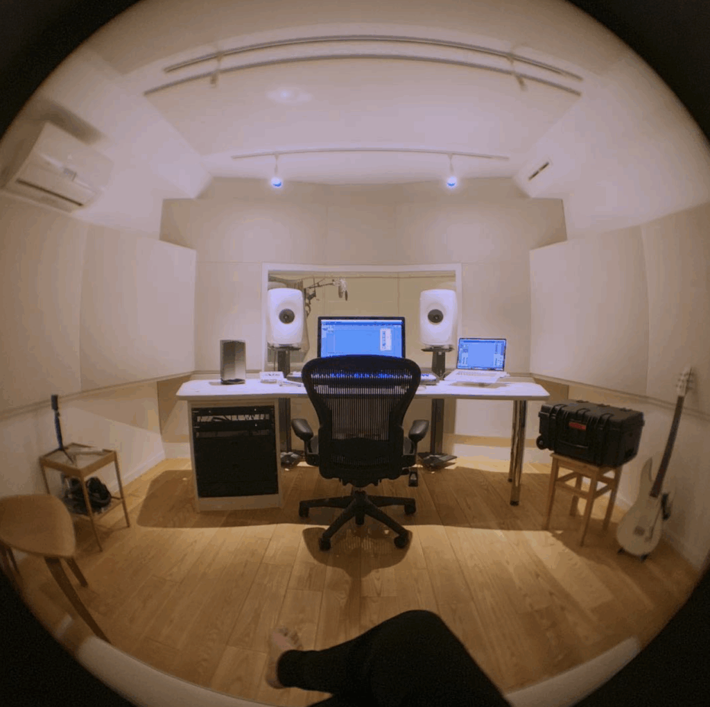 Nakata’s studio is notably compact, measuring approximately 4m x 3m, with acoustic treatment and a small recording booth. The setup includes quality microphone preamps and converters, though he relies primarily on virtual instruments and plugins rather than extensive outboard gear.
